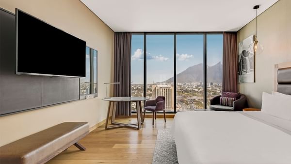 Las obras de arte y los muebles modernos, las maderas cálidas y la clásica gama de colores neutros crean un espacio elegante y relajante para trabajar o divertirse. Las comodidades estándar en la habitación incluyen Wi-fi gratis, acogedoras camas con colchones reforzados y sábanas de lujo, batas mullidas, mini bar y televisores de pantalla plana con canales por cable. Déjate consentir con nuestro servicio a la habitación las 24 horas del día y relájate después de un día de viaje, reuniones o de explorar todo lo que Monterrey tiene para ofrecer.