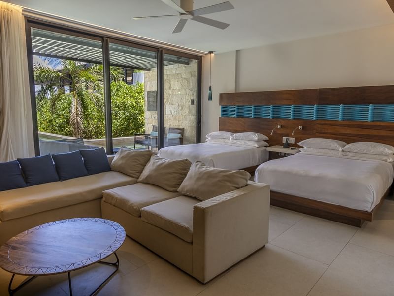 Un espacio donde el diseño elegante y los amenities de alta gama se combinan con la frescura del agua y la cercanía del sol, creando la mezcla perfecta de lujo y ocio en un entorno íntimo y relajado. Ideal para amigos o parejas, esta habitación ofrece dos camas Queen vestidas con ropa de cama de lujo y acceso directo, desde tu terraza privada, a una alberca semi‑privada que invita a sumergirse en cualquier momento del día. Deja que la noche te envuelva, mañana será un motivo para celebrar.