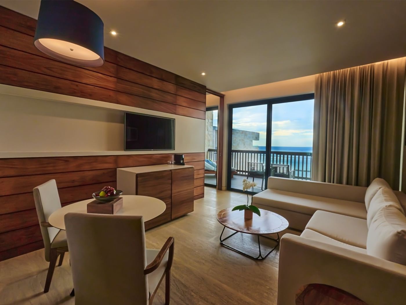 La luz matinal, las vistas infinitas al mar y una atmósfera de serenidad absoluta se combinan en esta suite vibrante, donde sus ventanales de suelo a techo y un balcón privado invitan a que el océano entre en cada instante para ser parte de cualquier celebración. Un salón independiente y un cuarto de baño de lujo completan este refugio costero, pensado para quienes buscan una experiencia que equilibra y conecta con el mar. Aquí, cada amanecer es una promesa y cada noche, una celebración.