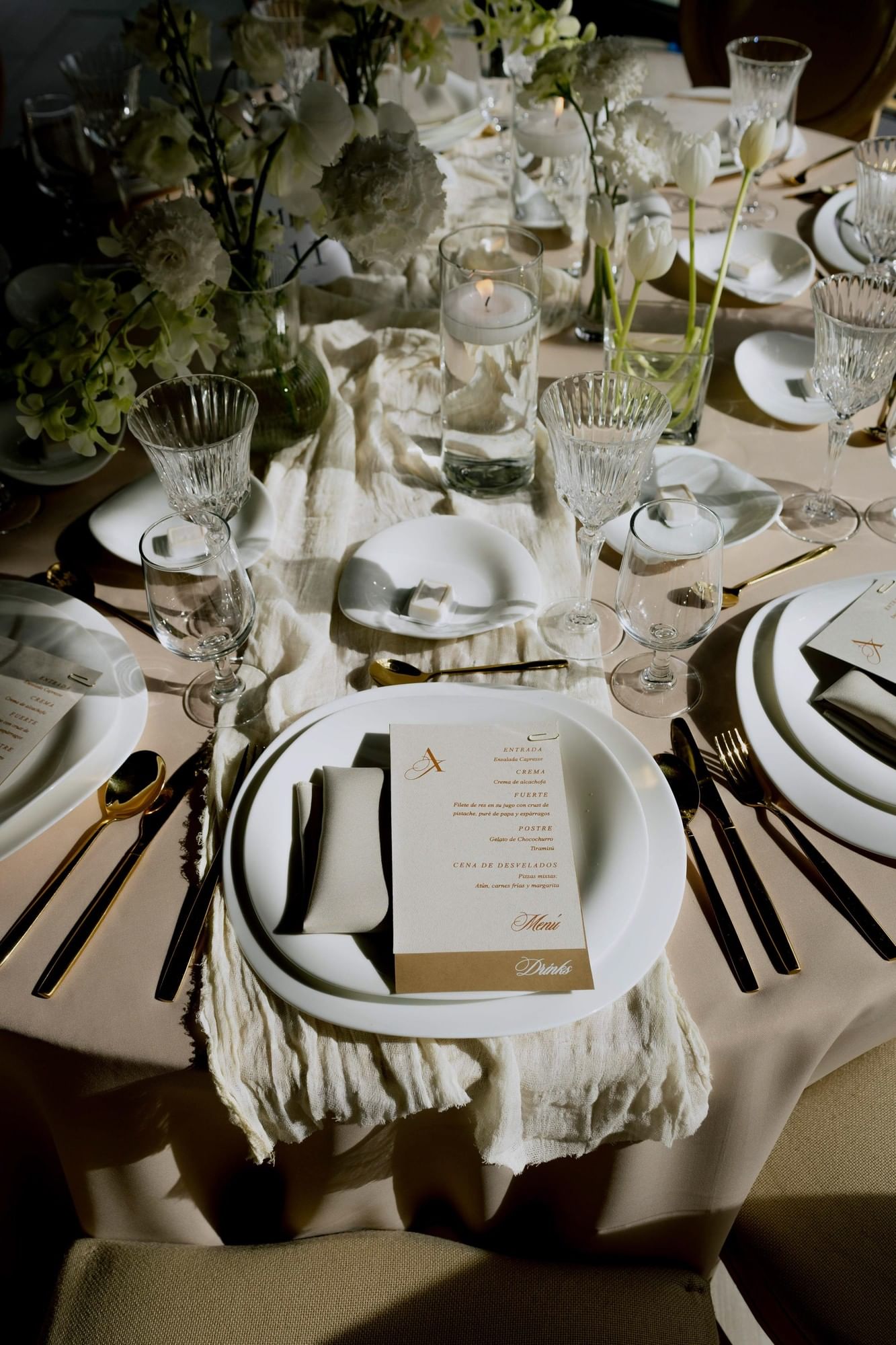 - Base plates, linens, napkins, and colored glassware of your choice