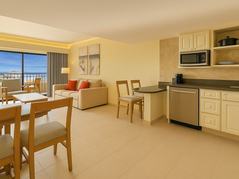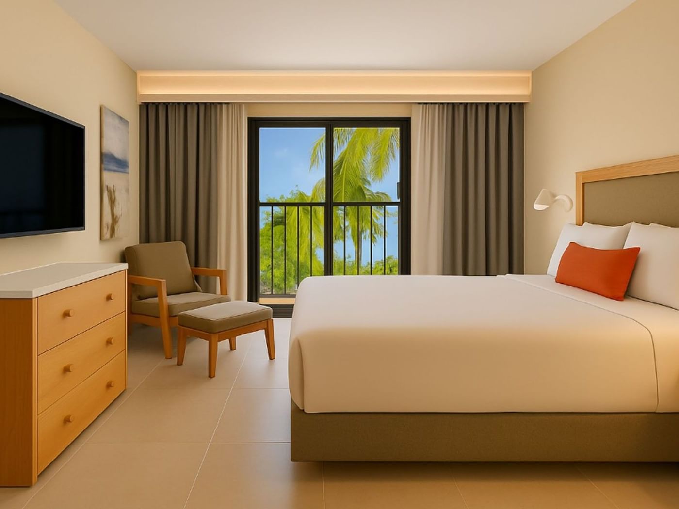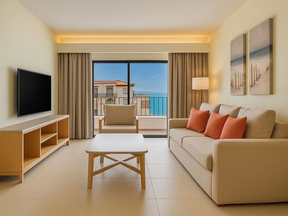 Discover comfort and tranquility in this fully renovated villa perfect for an unforgettable family vacation. With space for up to four guests, this spacious villa features a King-size bed, a double sofa bed, and a balcony with a partial ocean view that invites you to relax. It includes a modern bathroom with a rain shower, vanity mirror, and hairdryer, as well as air conditioning, cable TV, electronic safe, clock radio, and ironing kit.