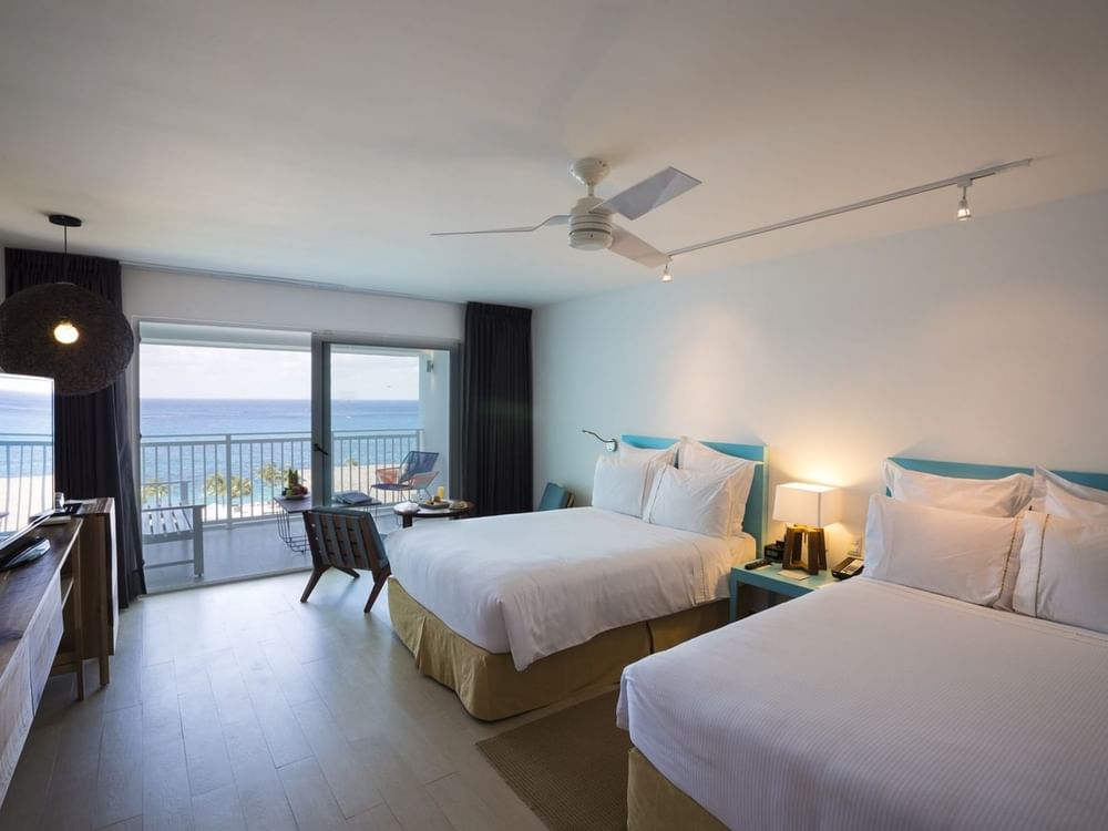 A relaxing atmosphere and friendly comfort are the main characteristics of this room. Its main attraction: it is its beautiful view of the sea. The decoration with warm tones is complemented by the relaxed atmosphere that will make you feel renewed. It has 2 double beds and is equipped with hi-speed Wi-fi, minibar, 55" LED TV with cable channels, air conditioning, ceiling fan, electronic safe and 24-hour room service. The bathroom includes a rain shower and a hair dryer.