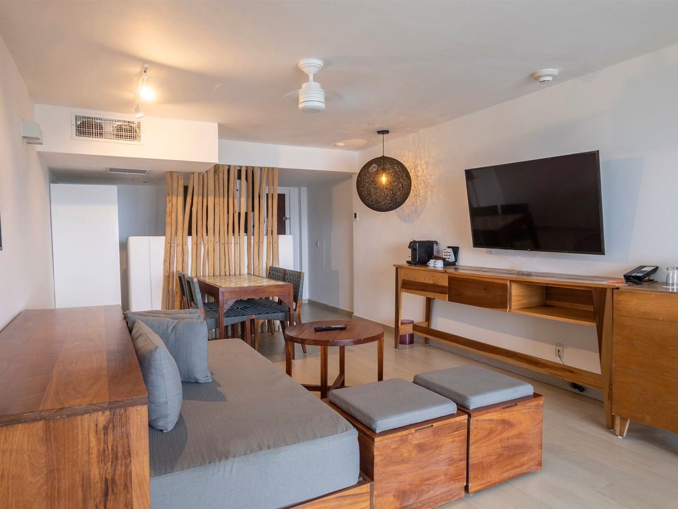Designed to create unforgettable moments, this suite is an enchanting retreat in a harmonious environment. Experience exceptional comfort in this splendid suite. Its spaciousness and beautiful design allows you to have a bedroom with a king bed, a living room with a pull-out couch and a dining area, two 55” LED TV'S, 2 full bathrooms, air conditioning, ceiling fans, High speed WiFi, minibar as well as wonderful views of the Caribbean Sea.