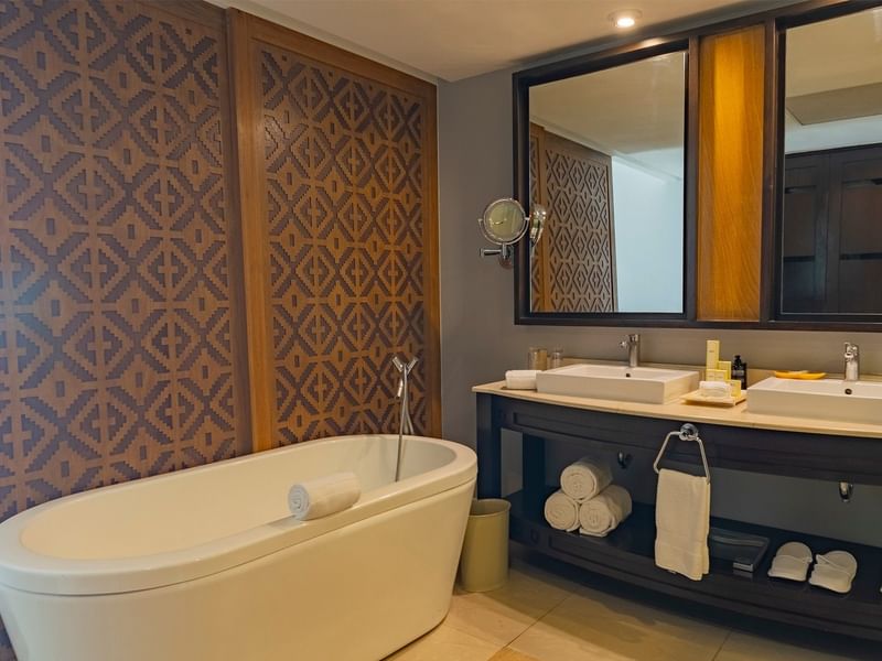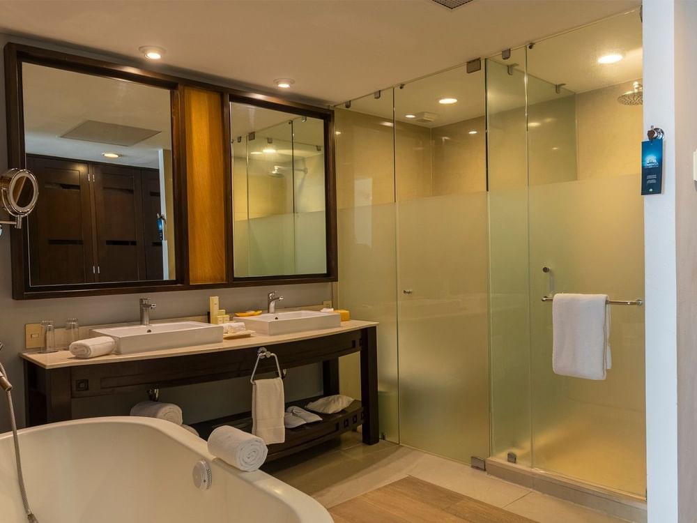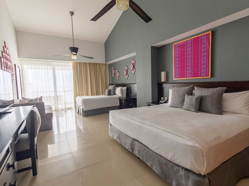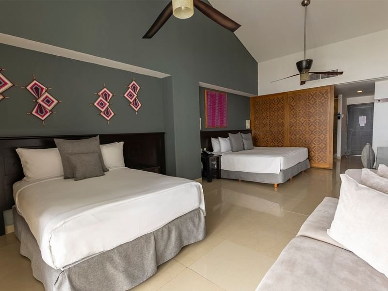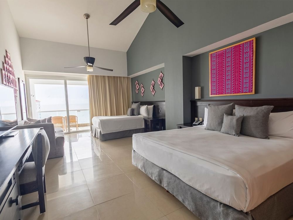 Spacious Junior Suite of 592 sq ft with magnificent full Ocean View. Accommodations include two double beds along with a comfortable living area, WiFi and HD TV with cable channels. The bathroom offers a combined bathtub and shower, plus separate shower, two sinks, luxury bath amenities, and hairdryer. Also, the furnished terrace includes a whirlpool tub and stunning views.