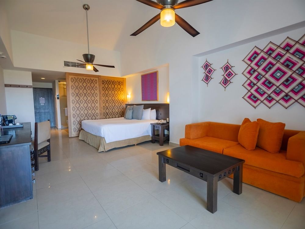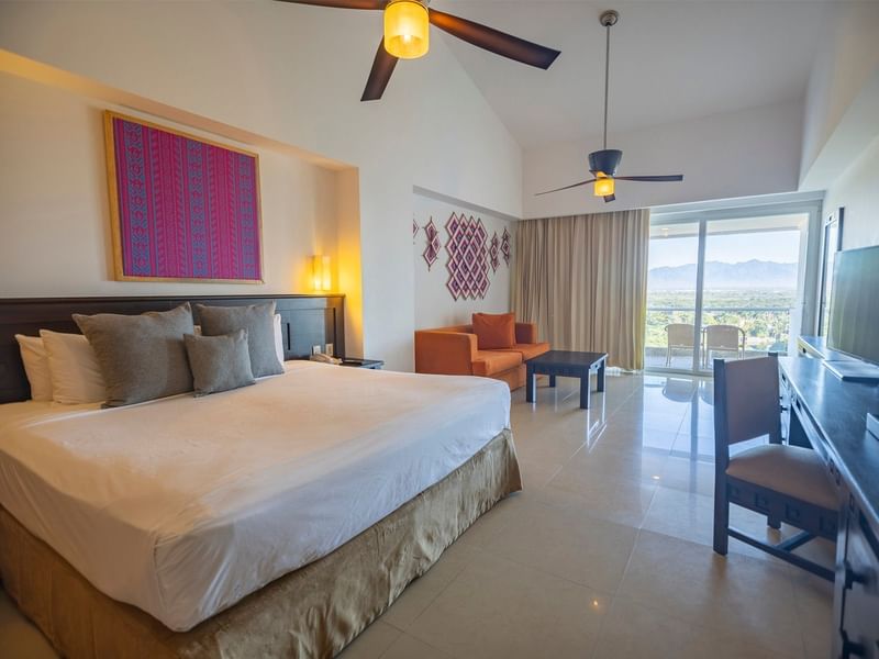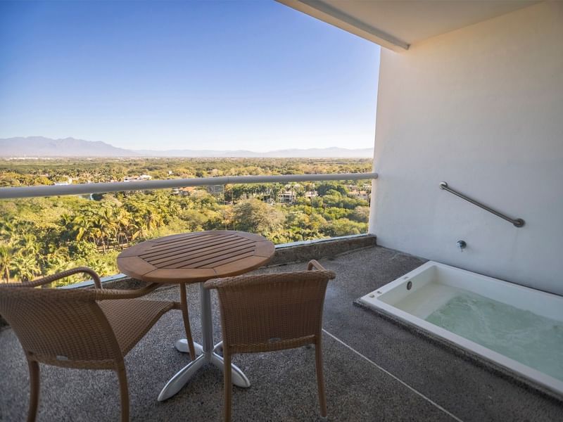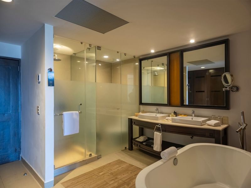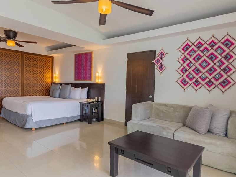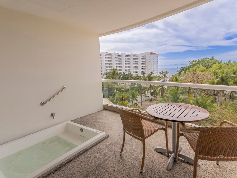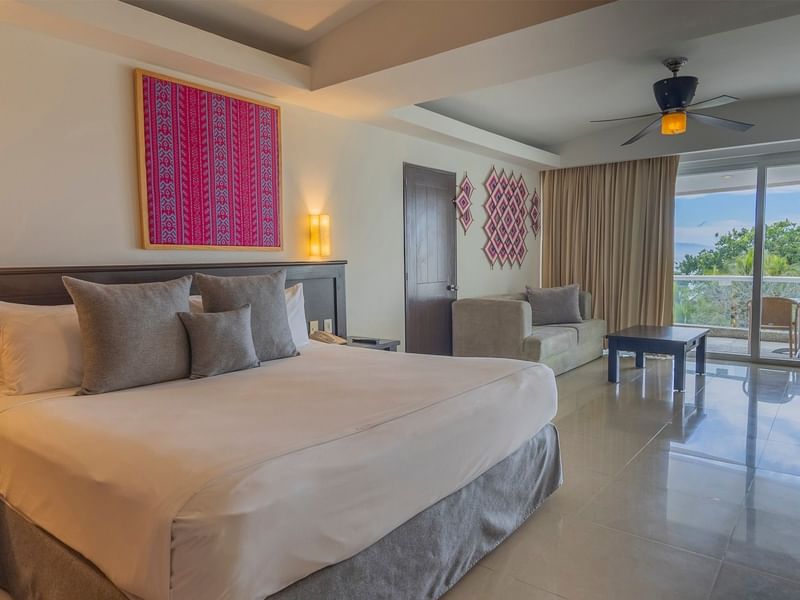 Spacious Junior Suite of 592 sq ft with magnificent partial Ocean View. Accommodations include one king size bed along with a comfortable sofa in the living area, WiFi included, and HD TV with cable channels. The bathroom offers a separate bathtub and shower, double sink, bathroom amenities, and hair dryer. Also, the furnished terrace includes a whirlpool tub and stunning views.