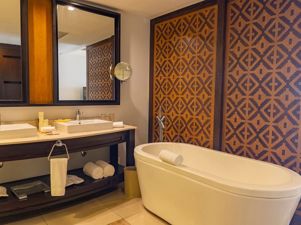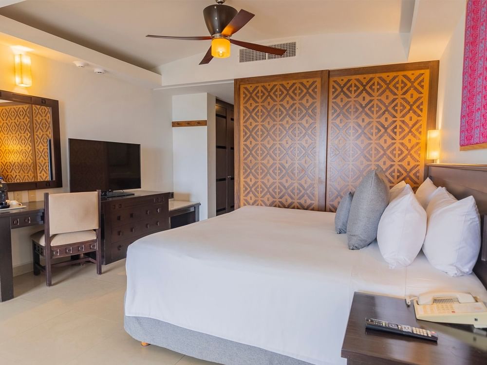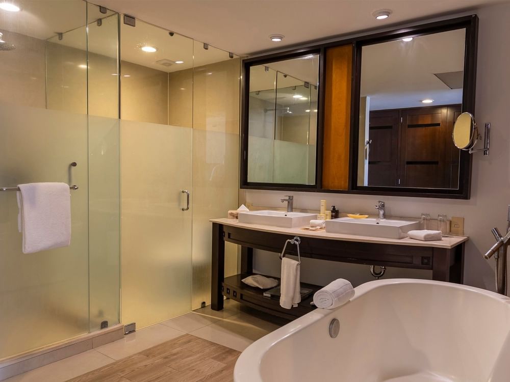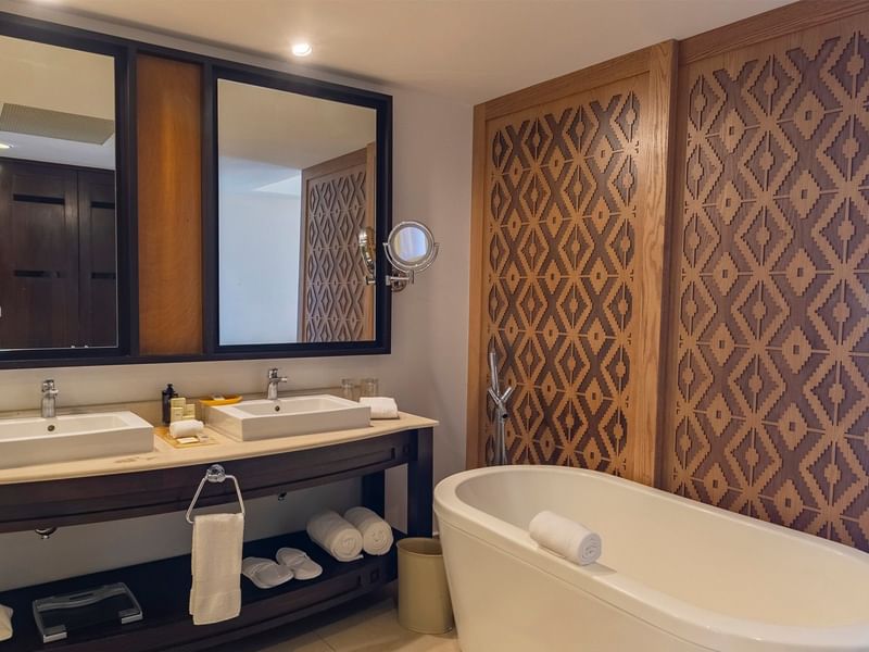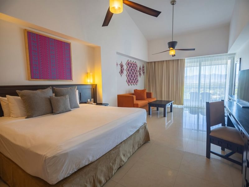 Spacious Junior Suite of 592 sq ft with magnificent partial Ocean View. Accommodations include one king size bed along with a comfortable sofa in the living area, WiFi included, and HD TV with cable channels. The bathroom offers a separate bathtub and shower, double sink, bathroom amenities, and hair dryer. Also, the furnished terrace includes a whirlpool tub and stunning views.