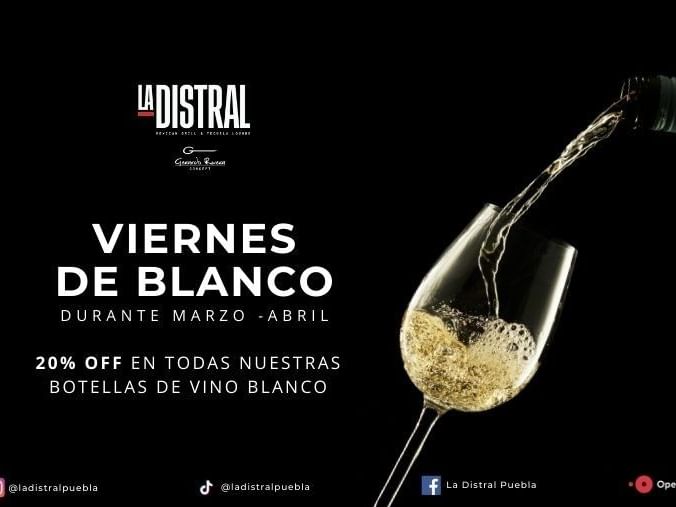 Enjoy an elegant and refreshing experience at Grand Fiesta Americana Puebla with our exclusive White Fridays at La Distral. Throughout March and April, indulge in a curated selection of white wines with 20% off all bottles, perfect for elevating a sophisticated evening.