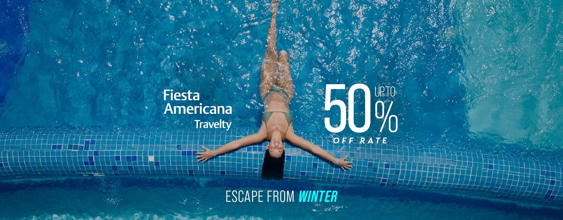 For limited time receive up to 50% off. Offer valid on new bookings until December 16, 2025. Traveling between December 4, 2025 through March 20, 2026. Complimentary round-trip airport transfers available at Live Aqua Punta Cana (at PUJ), Live Aqua Cancún, Grand Fiesta Americana Los Cabos All Inclusive Golf & Spa, Grand Fiesta Americana Coral Beach Cancún All Inclusive Spa Resort, Fiesta Americana Condesa Cancún All Inclusive, Fiesta Americana Puerto Vallarta All Inclusive & Spa. Bookings at 1 800 FIESTA 1 or at fiestamericanatravelty.com. All bookings are subject to availability and must be made in advance. Offer is not valid for groups/conventions. Existing closed out and blackout dates remain applicable and does not apply for groups. Grupo Posadas (Fiesta Americana Travelty).