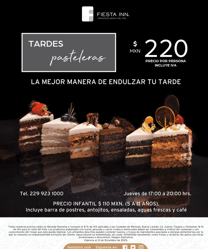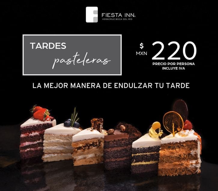 En Fiesta Inn Veracruz Boca del Río endulza tus tardes con una experiencia irresistible. Todos los jueves, déjate consentir con nuestra exclusiva barra de postres, antojitos, ensaladas, aguas frescas y café, ideal para compartir un momento delicioso en compañía.