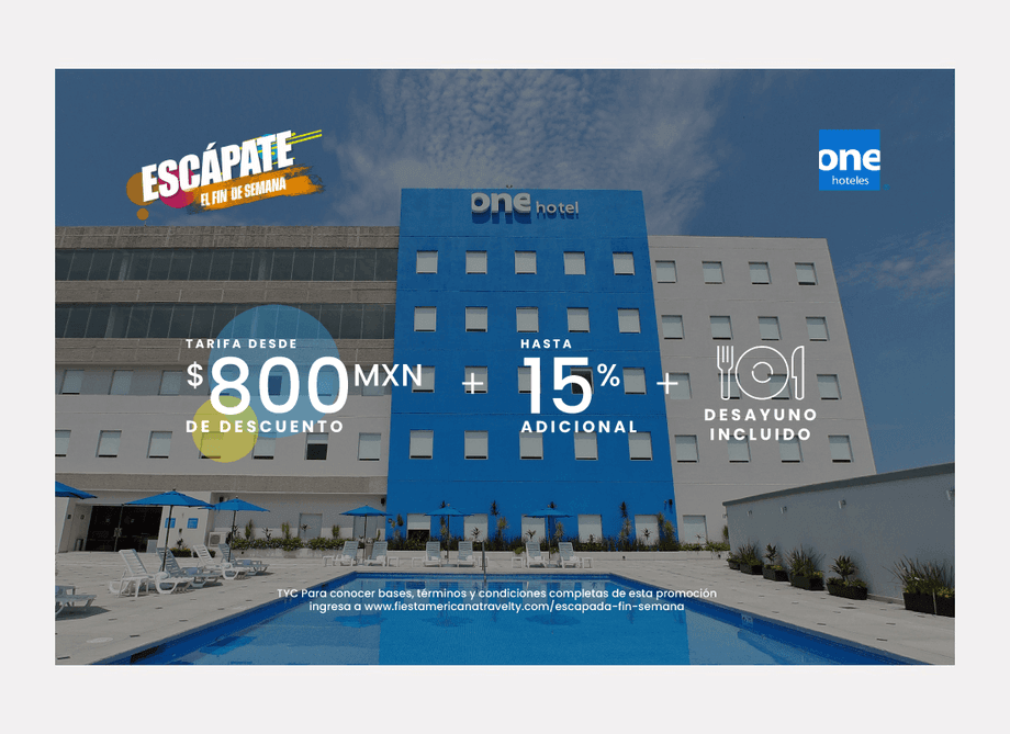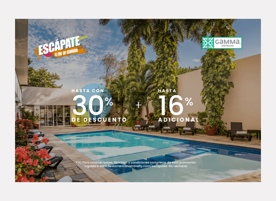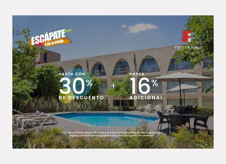 • Reserva con hasta con un 30% de descuento + descuento adicional en los hoteles Fiesta Inn y Gamma,