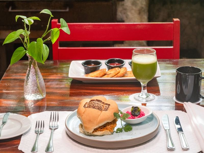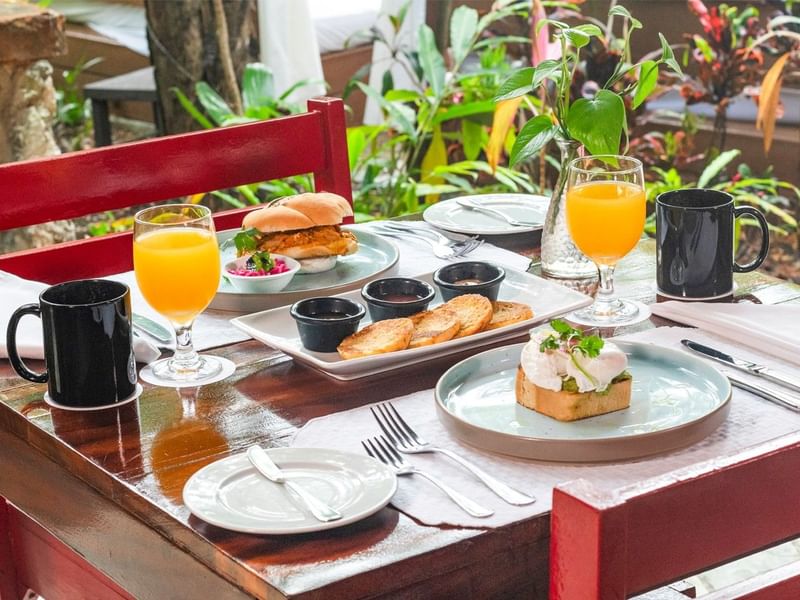 Nuestro concepto te ofrece un viaje culinario inigualable a través de los deliciosos sabores y aromas que nuestros chefs crean con ingredientes naturales de la región, además de refrescantes bebidas y cócteles en todo momento.