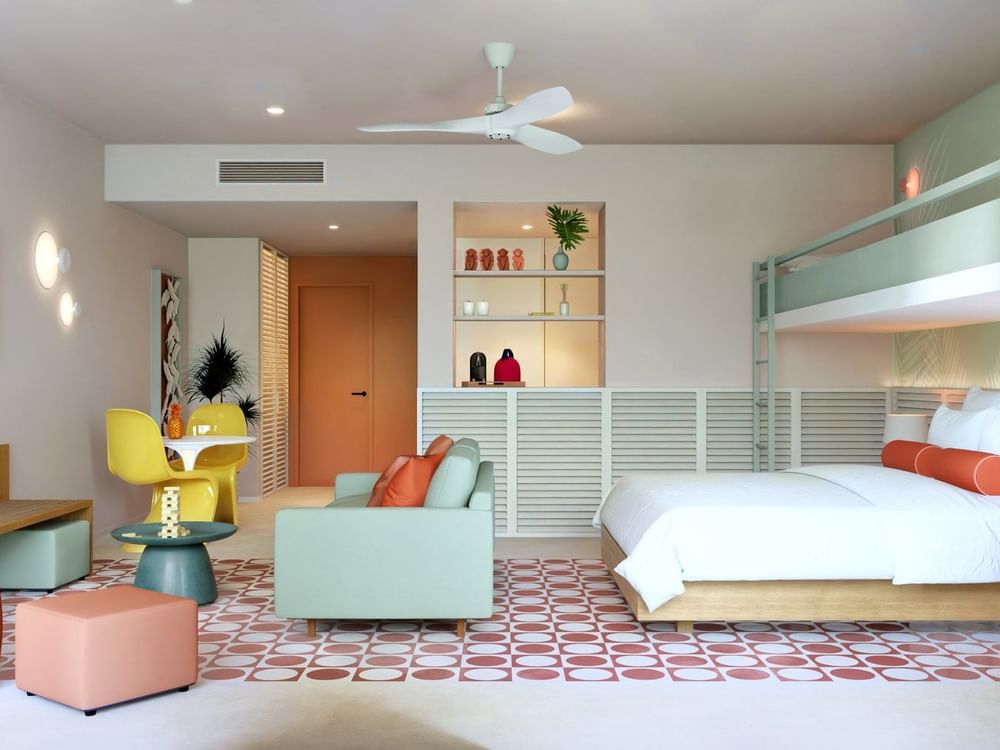 La diversión es parte de esta encantadora suite familiar, ya que posee un acceso directo a la piscina desde tu suite. Cuenta con una hermosa terraza para relajarse con las vistas, una cama King y una litera para recrear la mejor de las experiencias. Todo está incluido, deléitate con las amenidades premium disponibles en tu habitación.