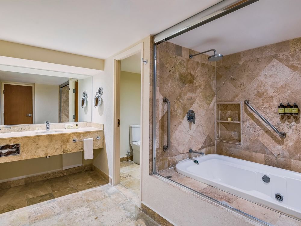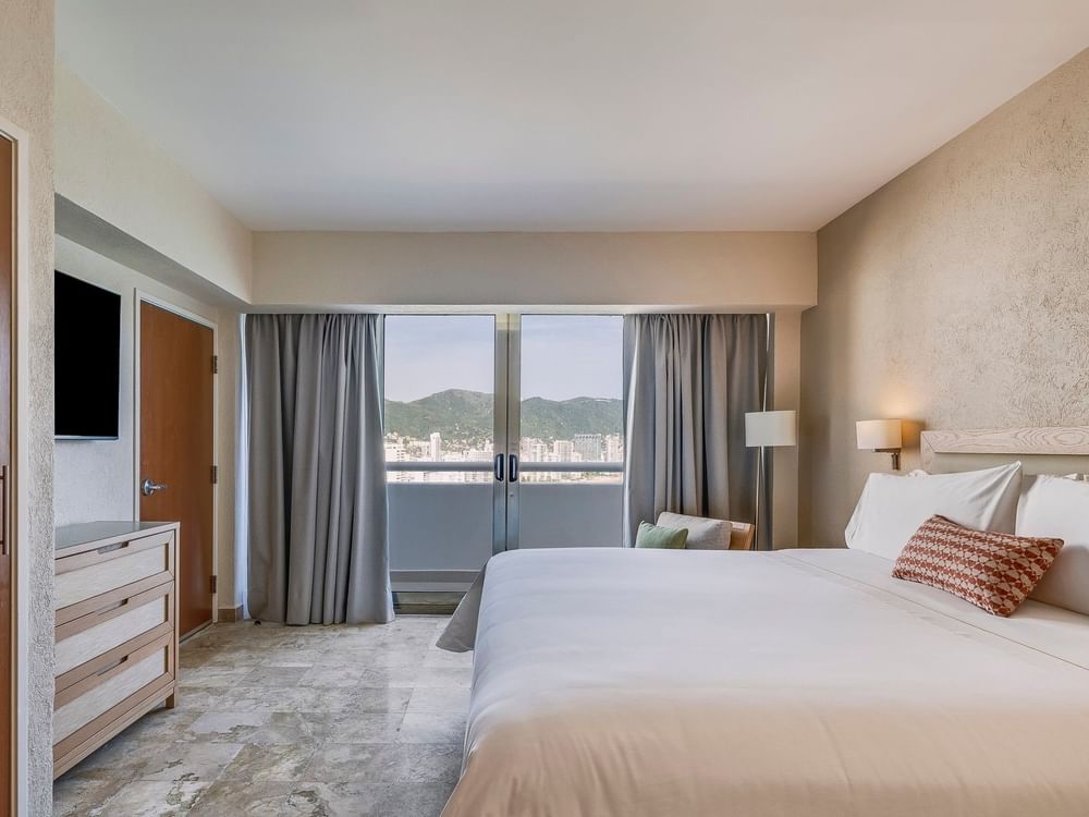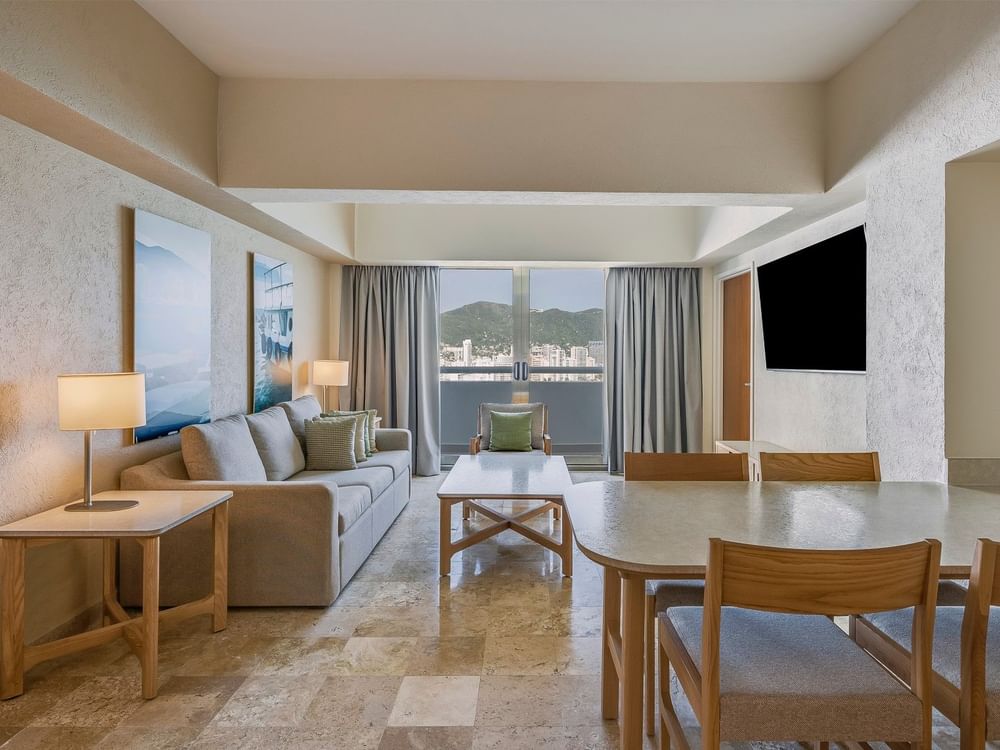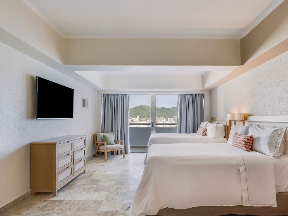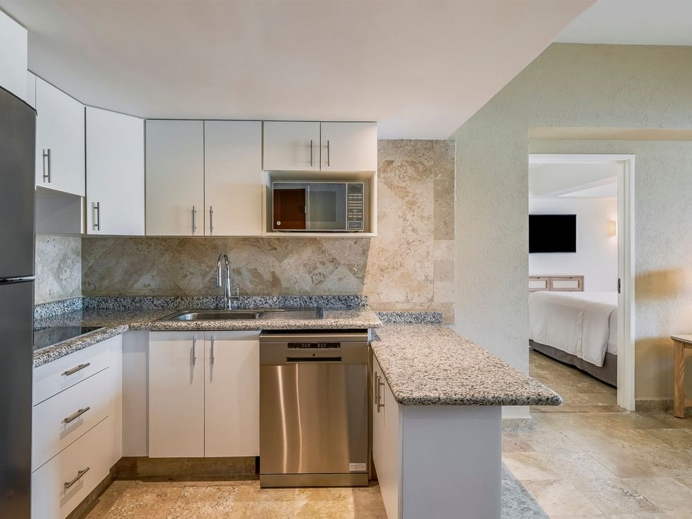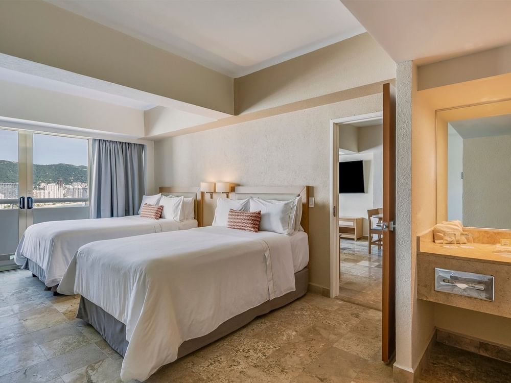 Una gran estancia embellecida por la magnífica vista al mar ideal para pasar momentos increíbles con tu familia o grupo de amigos que quieran compartir un espacio agradable. Esta suite tiene un dormitorio principal con una cama King Size y la segunda habitación cuenta con dos camas dobles, ambas recámaras cuentan con baño privado y televisión. Otras comodidades incluyen acceso a internet, sala de estar con sofá cama, una cocina completa con estufa eléctrica, refrigerador, lava vajillas, utensilios de cocina, cafetera, horno de microondas, tostadora, licuadora y vajilla (platos, vasos y cubiertos). Capacidad máxima para ocho personas (entre adultos y niños).
