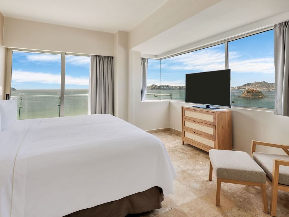 Experimenta el placer de hospedarte con tu familia y amigos en una suite de tres dormitorios con una espectacular vista frontal al mar. Dos de las recámaras cuentan con cama king size y la tercera dos camas dobles. Para tu comodidad, cada habitación tiene baño privado y acceso a internet. Otras comodidades incluyen acceso a internet, sala de estar con sofá cama, una cocina completa con estufa eléctrica, refrigerador, lava vajillas, utensilios de cocina, cafetera, horno de microondas, tostadora, licuadora y vajilla (platos, vasos y cubiertos). Capacidad máxima para 10 personas (entre adultos y niños).