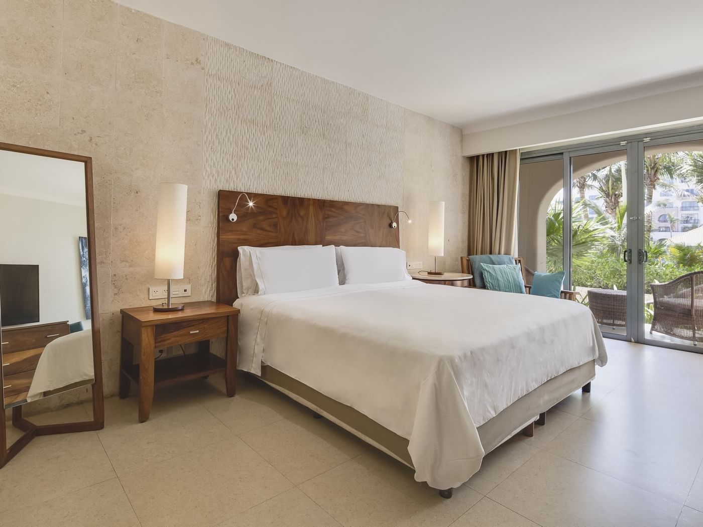 Disfruta de la perfecta atmósfera que ofrece esta habitación de estilo mexicano contemporáneo y de su hermosa vista al jardín. Cuenta con cama King, almohadas de lujo, lámpara de lectura, muebles de madera, caja de seguridad, cerraduras eléctricas, cafetera, minibar, Internet inalámbrico, pantalla de 55 pulgadas y una hermosa vista al jardín. El baño te ofrece rain shower.