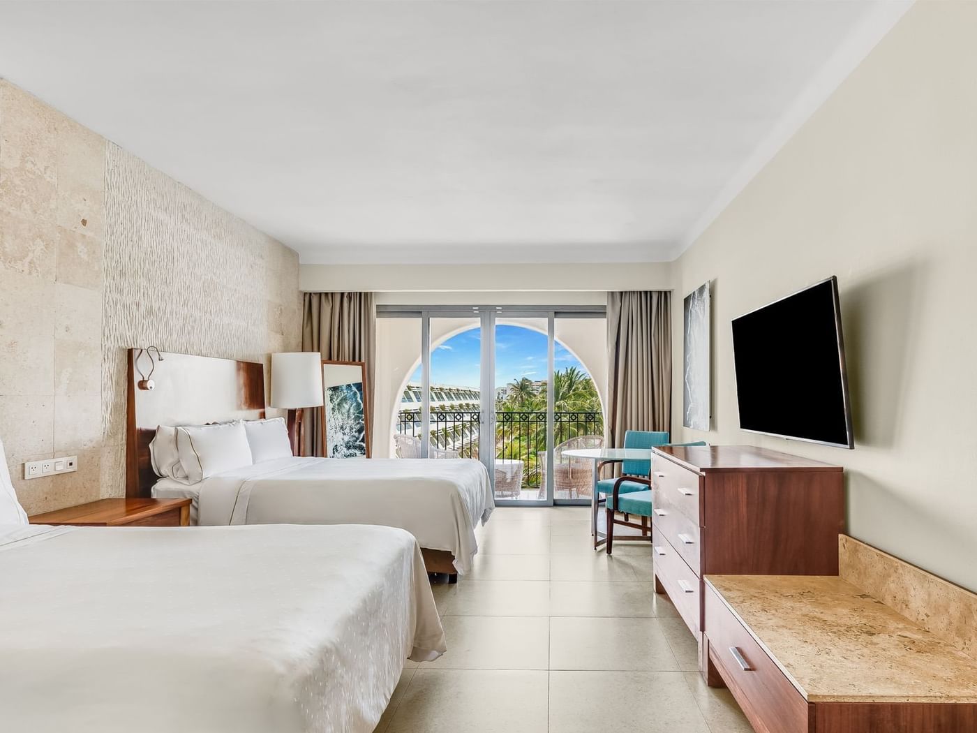 Repara el sueño en este espacio absolutamente confortable. Los cálidos tonos tierra y los toques mexicanos como la típica piedra de conchuela en las cabeceras invitan a disfrutar de un placentero descanso. Cuenta con lámpara de lectura, muebles de madera, caja de seguridad, cerraduras eléctricas, cafetera, minibar, Internet inalámbrico, pantalla de 55 pulgadas y una hermosa vista al jardín. El baño ofrece rain shower.