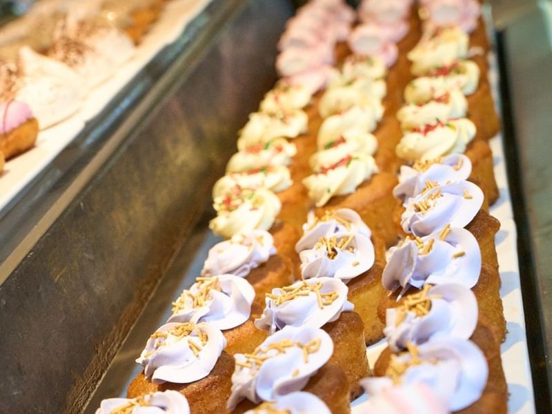 Restaurante con temática de mercado gastronómico, con puestos coloridos y productos frescos, bocadillos locales e internacionales