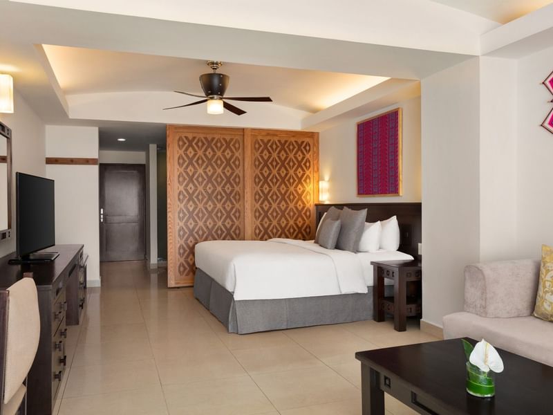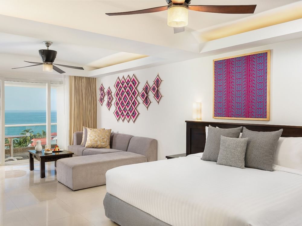 En esta Honeymoon Junior Suite de 55 m2, el amor y el romance se convierten en una celebración. Vive una atmósfera que invita al romanticismo, la tina de hidromasaje y la vista al Océano Pacífico desde tu terraza privada son la dupla perfecta para la relajación que aunadas a el acceso exclusivo al Fiesta Club Lounge hacen que la estancia sea una experiencia memorable. Cuenta con un cómodo sofá en el área de estar, conexión WiFi incluida y TV HD con canales de cable. El baño ofrece un ambiente con bañera y ducha separadas, bata y pantuflas, doble lavabo, amenidades de baño y secadora de cabello. Adicional, como parte de los beneficios de nuestras Honeymoon Junior Suites, disfruta de una botella de Moët de 375 ml y fresas cubiertas de chocolate a tu llegada, servicio de preparación de Jacuzzi, acceso a las áreas húmedas del hotel y un masaje en pareja con duración de 50 min por estancia (estancia mínima de 3 noches), servicios de Concierge, amenidades exclusivas y acceso a nuestro Fiesta Club Lounge donde podrás deleitarte de desayuno continental cada mañana, snacks, aperitivos y licores Premium durante el día y noche. Entre los servicios adicionales se incluye Room Service 24 horas, minibar, cafetera, escritorio bien iluminado, caja de seguridad, plancha/tabla de planchar, y servicio de cortesía nocturna. Todas las habitaciones son de no-fumar.