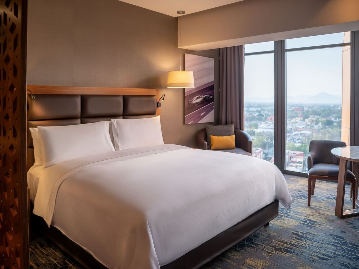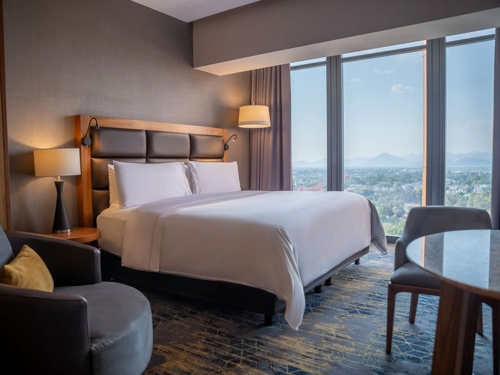 Haz tuyo este espacio moderno y confortable cuya ubicación privilegiada te garantiza una increíble vista de la Ciudad de México mientras trabajas, descansas o te relajas. Esta moderna y cómoda habitación cuenta con una cama King Size, aire acondicionado, calefacción, televisor Smart LED de 55 pulgadas con canales vía satélite, mini bar, baño privado, amenidades especiales como bata, pantuflas, báscula y kit de baño completo, secadora de pelo, ducha, plancha y tabla de planchar, espacio de trabajo para computadora portátil y servicio a la habitación disponible las 24 horas.