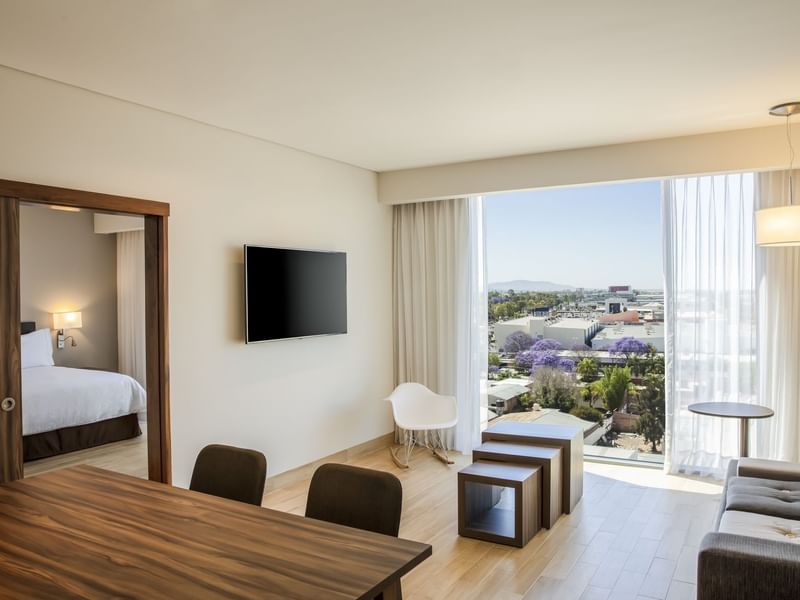 Tu suite te espera para tener días de productividad y logros, con noches relajantes. Aquí lograrás un balance, desconéctate o sé activo cuando lo decidas. Reconfórtate con la amplitud de esta suite que te ofrece sala, comedor y cocineta. El ambiente es cálido, el mobiliario cómodo y funcional. Recuéstate en tu confortable sillón y solicita a room service lo que desees del menú, mientras transmites tu serie favorita desde tu dispositivo a la pantalla de TV. Prepárate para descansar profundamente en la suave cama King Size. Si requieres continuar con tus pendientes, puedes elegir el escritorio.