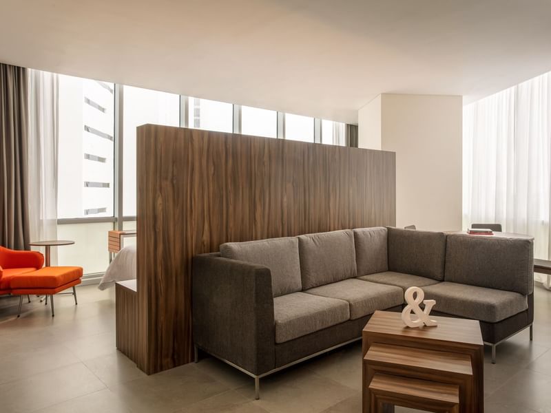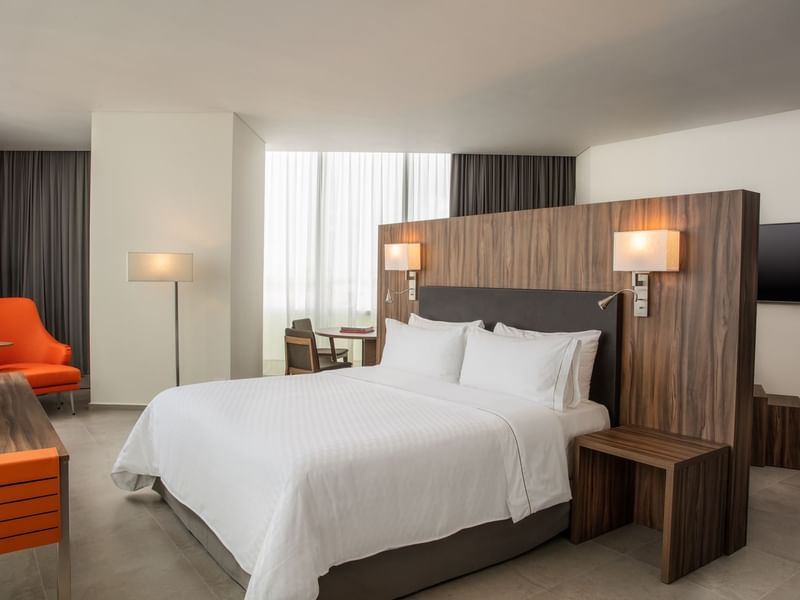 El ambiente relajado y moderno de esta suite, con amenidades especiales que le agregan valor a tu experiencia, te ayudará a despejar tu mente, por si tienes que terminar algún pendiente, solo relájate en la cama King Size, disfrutando de la TV, escuchando tu música favorita o leyendo algún libro. Encuentra el balance y disfruta tu estancia gracias al mobiliario funcional y agradable de esta habitación.