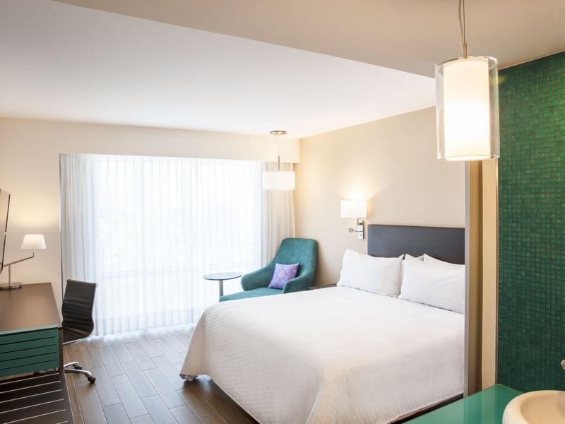 Relájate y siéntete seguro en esta habitación que cuenta con el diseño y los requerimientos que necesitas para que tu estancia sea flexible: podrás ser productivo o hacer una pausa. El ambiente es cálido, el mobiliario cómodo y funcional. Prepárate para descansar profundamente en la cama King Size. Haz una pausa y solicita a room service lo que desees del menú mientras transmites tu serie favorita desde tu dispositivo a la pantalla de TV. Después de un día lleno de logros, toma un baño disfrutable. Siéntete tranquilo con la barra de seguridad de la regadera, escusado elevado con agarraderas y puerta ancha. Si requieres continuar con tus pendientes, puedes hacerlo en el escritorio.