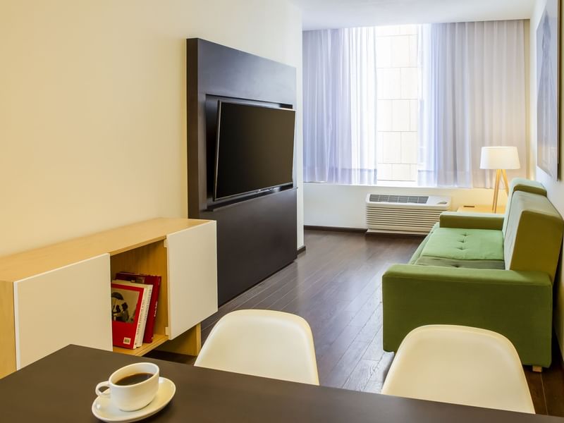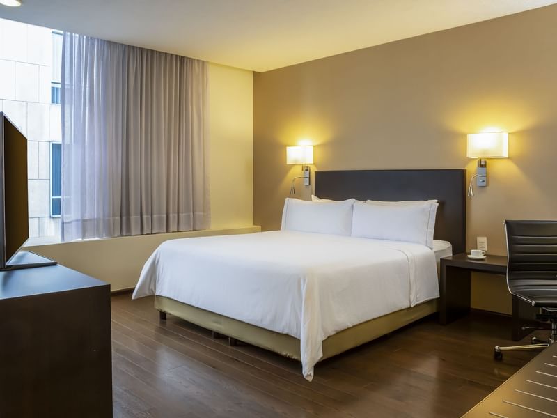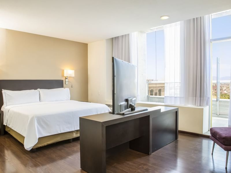El ambiente relajado y moderno de esta suite, con amenidades especiales que le agregan valor a tu experiencia, te ayudará a despejar tu mente, por si tienes que terminar algún pendiente, solo relájate en la cama King Size, disfrutando de la TV, escuchando tu música favorita o leyendo algún libro. Encuentra el balance y disfruta tu estancia gracias al mobiliario funcional y agradable de esta habitación.