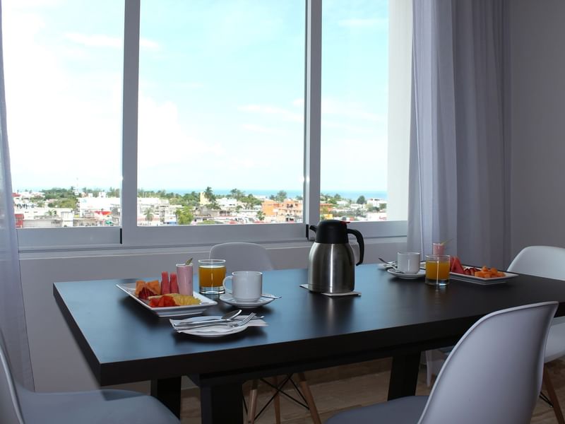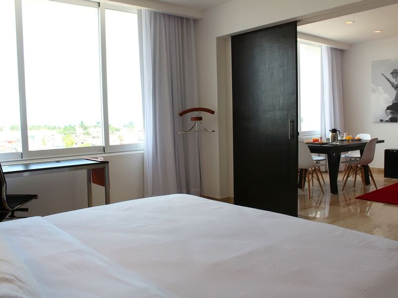 El ambiente relajado y moderno de esta suite, con amenidades especiales que le agregan valor a tu experiencia, te ayudará a despejar tu mente, por si tienes que terminar algún pendiente, solo relájate en la cama King Size, disfrutando de la TV, escuchando tu música favorita o leyendo algún libro. Encuentra el balance y disfruta tu estancia gracias al mobiliario funcional y agradable de esta habitación.