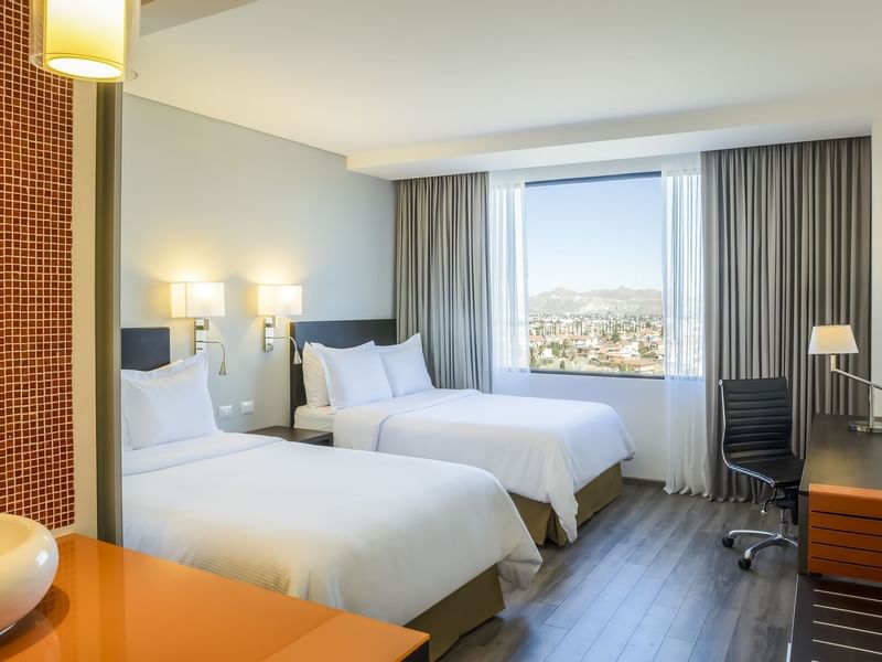 Recupera tu equilibrio en esta habitación. Todo está dispuesto para que tengas noches plenas y días productivos. El ambiente es cálido, el mobiliario cómodo y funcional. Prepárate para descansar profundamente en cualquiera de las dos camas matrimoniales. Haz una pausa y solicita a room service lo que desees del menú mientras transmites tu serie favorita desde tu dispositivo a la pantalla de TV. Después de un día lleno de logros, toma un baño disfrutable. Si requieres continuar con tus pendientes, puedes hacerlo desde tu confortable sillón.