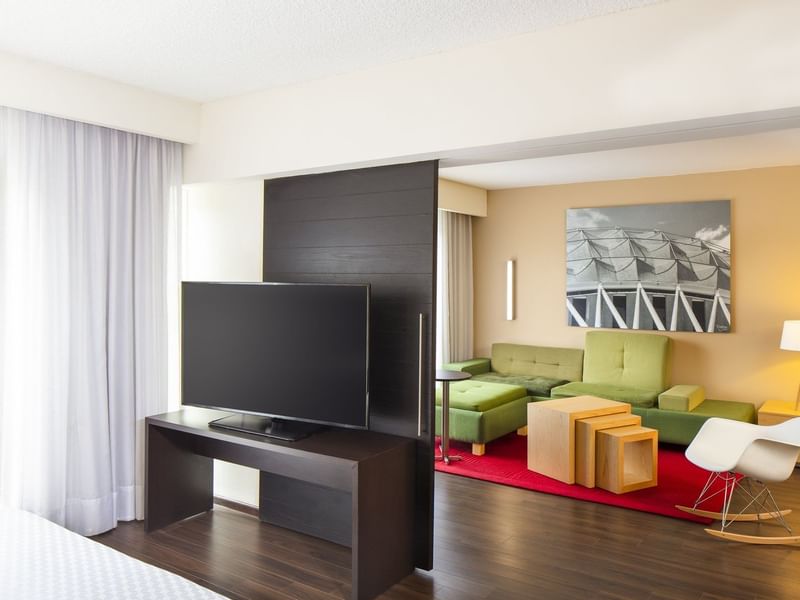 El ambiente relajado y moderno de esta suite, con amenidades especiales que le agregan valor a tu experiencia, te ayudará a despejar tu mente, por si tienes que terminar algún pendiente, solo relájate en la cama King Size, disfrutando de la TV, escuchando tu música favorita o leyendo algún libro. Encuentra el balance y disfruta tu estancia gracias al mobiliario funcional y agradable de esta habitación.