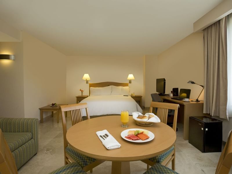 El ambiente relajado y moderno de esta suite, con amenidades especiales que le agregan valor a tu experiencia, te ayudará a despejar tu mente, por si tienes que terminar algún pendiente, solo relájate en la cama King Size, disfrutando de la TV, escuchando tu música favorita o leyendo algún libro. Encuentra el balance y disfruta tu estancia gracias al mobiliario funcional y agradable de esta habitación.