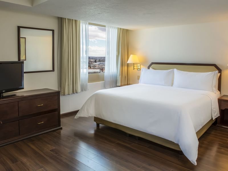Esta habitación agradable será un espacio amplio y cálido para ser productivo. En ella podrás relajarte con las amenidades que te aportarán a equilibrarte con un mobiliario cómodo, que te facilitará cumplir con tus planes. Ten un sueño reparador y descansa profundamente en la cama King Size. Solicita a room service lo que desees del menú, y disfruta de la privacidad de tu sala mientras continúas revisando tus pendientes. Para tu comodidad incluye horno de microondas, mini refrigerador y alacena, así como un comedor para cuatro personas. Haz una pausa, transmite tu serie favorita desde tu dispositivo a la pantalla de TV, toma un baño o recuéstate en el confortable sillón.