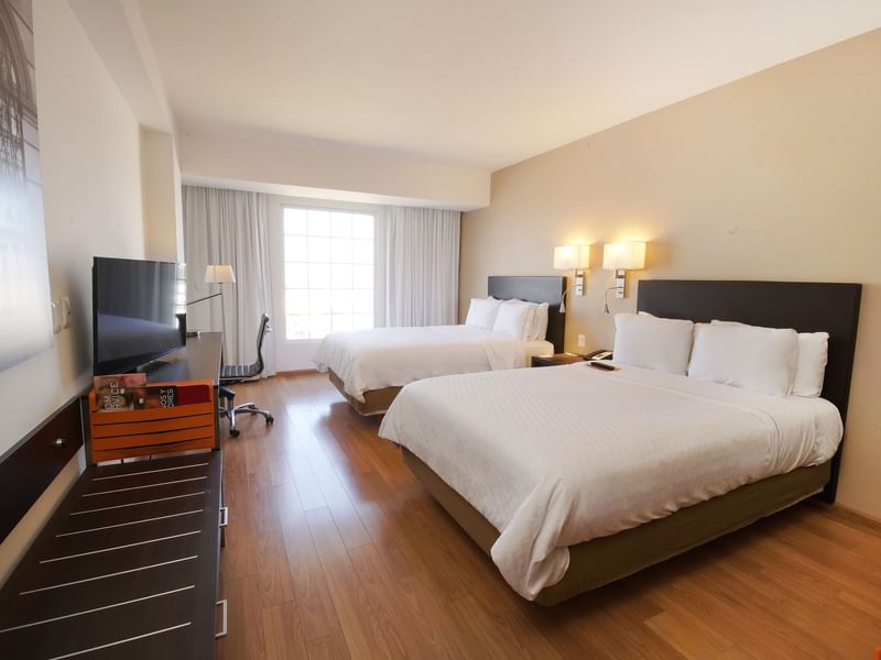 Tu habitación está diseñada para que puedas ser productivo. El ambiente es cálido y el mobiliario cómodo, te ayudará a cumplir tus planes. Queremos verte triunfar. Ten un sueño reparador y descansa profundamente en cualquiera de las camas matrimoniales. Haz una pausa, transmite tu serie favorita desde tu dispositivo a la pantalla de TV, toma un baño o recuéstate en el confortable sillón.