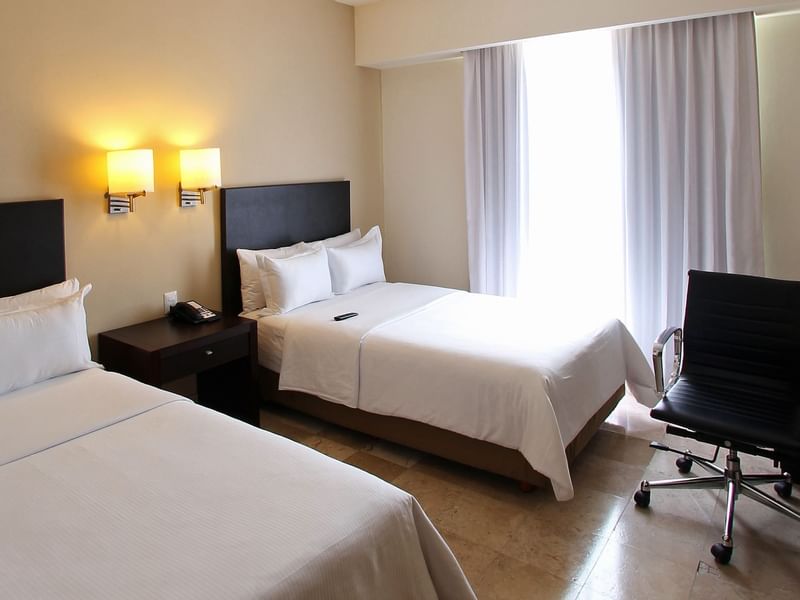 Tu habitación está diseñada para que puedas ser productivo. El ambiente es cálido y el mobiliario cómodo, te ayudará a cumplir tus planes. Queremos verte triunfar. Ten un sueño reparador y descansa profundamente en cualquiera de las camas matrimoniales. Solicita a room service lo que desees del menú, mientras continúas revisando tus pendientes. Haz una pausa, transmite tu serie favorita desde tu dispositivo a la pantalla de TV, toma un baño o recuéstate en el confortable sillón.