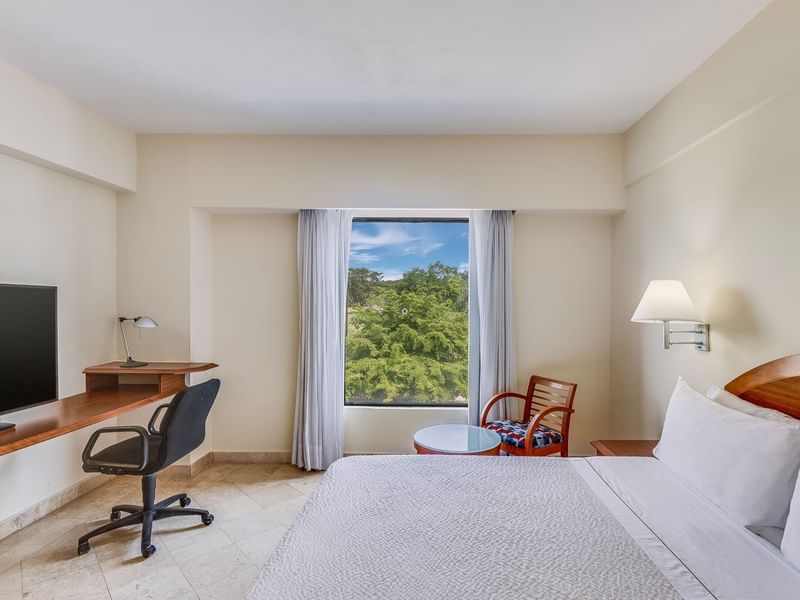 En esta confortable habitación encontrarás un anhelado equilibrio. Creemos en el balance de tu vida, aquí serás productivo o podrás desconectarte. El ambiente es cálido, el mobiliario cómodo y funcional. Prepárate para descansar profundamente en la cama King Size. Haz una pausa y solicita a room service lo que desees del menú mientras transmites tu serie favorita desde tu dispositivo a la pantalla de TV. Después de un día lleno de logros, toma un baño disfrutable. Si requieres continuar con tus pendientes, puedes hacerlo desde tu confortable sillón.
