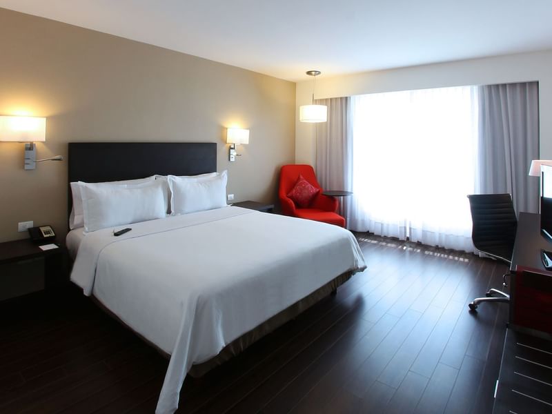 Continúa con tus objetivos en tu habitación, sé productivo en un espacio acogedor. El ambiente es cálido y el mobiliario cómodo, te ayudará a cumplir tus planes. Ten un sueño reparador y descansa profundamente en la cama King Size. Solicita a room service lo que desees del menú, mientras continúas revisando tus pendientes. Haz una pausa y disfruta tu programa favorito desde la pantalla de TV, toma un baño o recuéstate en el confortable sillón.