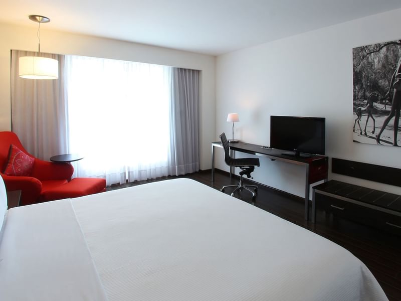 Tu habitación está diseñada para que puedas ser productivo. El ambiente es cálido y el mobiliario cómodo, te ayudará acumplir tus planes. Queremos verte triunfar. Ten un sueño reparador y descansa profundamente en cualquiera de las camas matrimoniales. Solicita a room service lo que desees del menú, mientras continúas revisando tus pendientes. Haz una pausa y disfruta tu programa favorito desde la pantalla de TV o toma un baño.