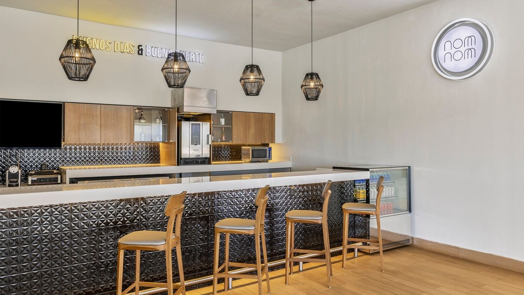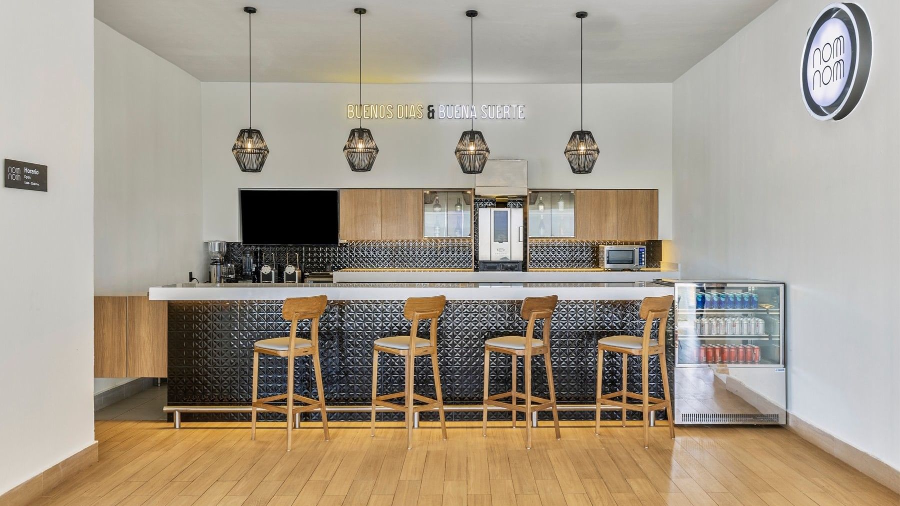 NOM NOM es un espacio oportuno, acogedor y contemporáneo para recargar la energía del viajero de negocios.
