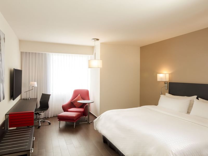 Queremos que te sientas seguro en tu habitación para que tu productividad continúe si así lo deseas. Cuenta con el diseño y los requerimientos que necesitas para que tu estancia sea ideal. El ambiente es cálido y el mobiliario, cómodo y funcional. Prepárate para descansar profundamente en cualquiera de las dos camas matrimoniales. Solicita a room service lo que quieras del menú. Toma un baño disfrutable. Siéntete tranquilo con la barra de seguridad de la regadera, escusado elevado con agarraderas y puerta ancha. Si requieres revisar tus pendientes, hazlo en el escritorio o donde te sientas cómodo.