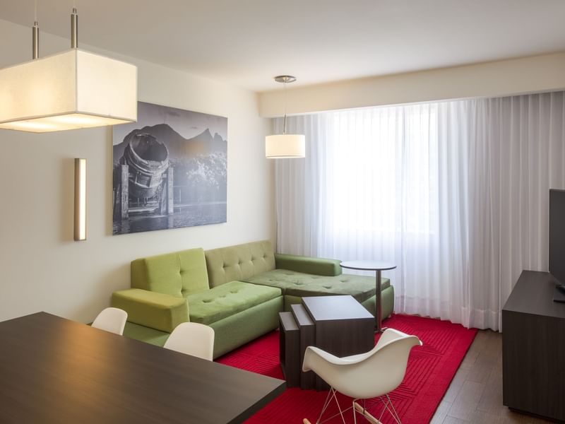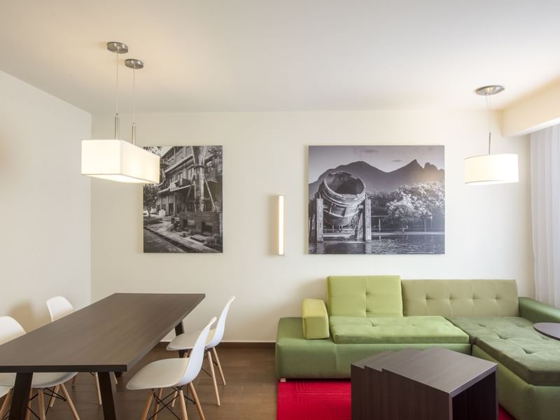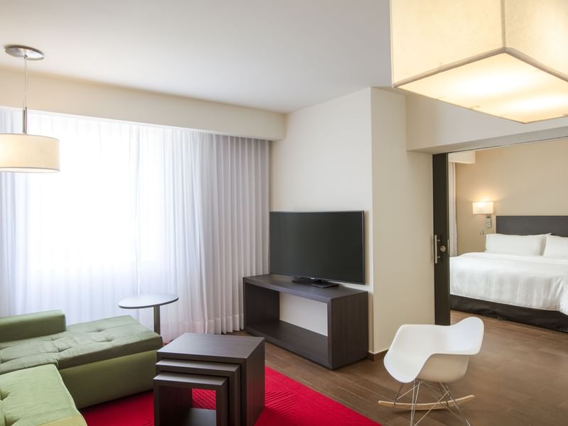 El ambiente relajado y moderno de esta suite, con amenidades especiales que le agregan valor a tu experiencia, te ayudará a despejar tu mente, por si tienes que terminar algún pendiente, solo relájate en la cama King Size, disfrutando de la TV, escuchando tu música favorita o leyendo algún libro. Encuentra el balance y disfruta tu estancia gracias al mobiliario funcional y agradable de esta habitación.