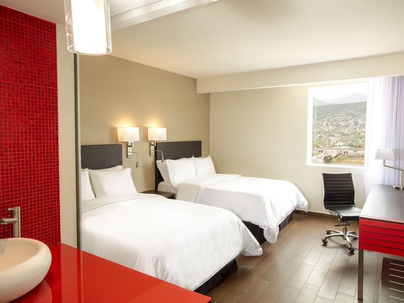 Tu habitación está diseñada para que puedas ser productivo. El ambiente es cálido y el mobiliario cómodo, te ayudará a cumplir tus planes. Queremos verte triunfar. Ten un sueño reparador y descansa profundamente en cualquiera de las camas matrimoniales. Solicita a room service lo que desees del menú, mientras continúas revisando tus pendientes. Haz una pausa, transmite tu serie favorita desde tu dispositivo a la pantalla de TV, toma un baño o recuéstate en el confortable sillón.