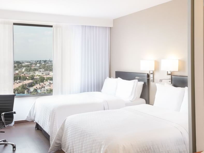 Tu habitación está diseñada para que puedas ser productivo. El ambiente es cálido y el mobiliario cómodo, te ayudará a cumplir tus planes. Queremos verte triunfar. Ten un sueño reparador y descansa profundamente en cualquiera de las camas matrimoniales. Mientras continúas revisando tus pendientes. Haz una pausa, disfruta de los canales que tenemos en la pantalla de TV, toma un baño o recuéstate en el confortable sillón.