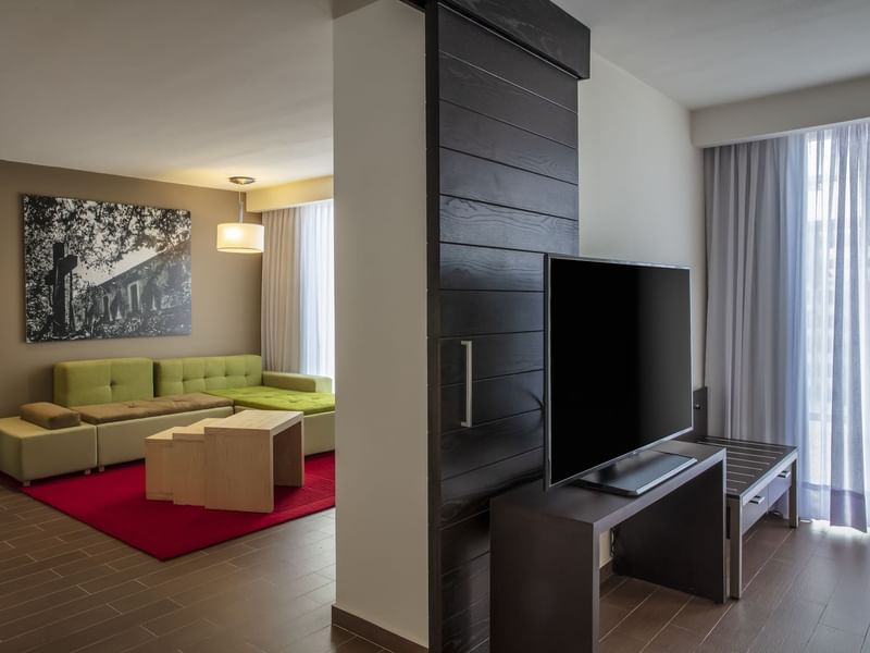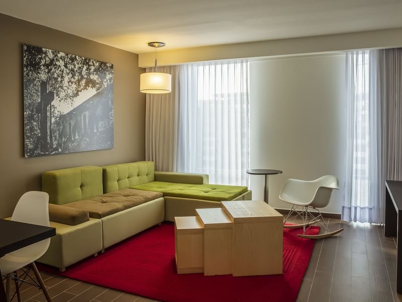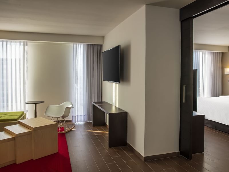 Aprovecha la amplitud de tu suite para lograr cada uno de tus objetivos. Queremos verte triunfar y por eso te apoyamos brindándote con un ambiente cálido y un mobiliario cómodo, te ayudará a cumplir tus planes. Ten un sueño reparador y descansa profundamente en una cama King Size. Solicita a room service lo que desees del menú, y disfruta del comedor o la privacidad de tu sala, mientras continúas revisando tus pendientes. Haz una pausa, transmite tu serie favorita desde tu dispositivo a la pantalla de TV, toma un baño o recuéstate en el confortable sillón.