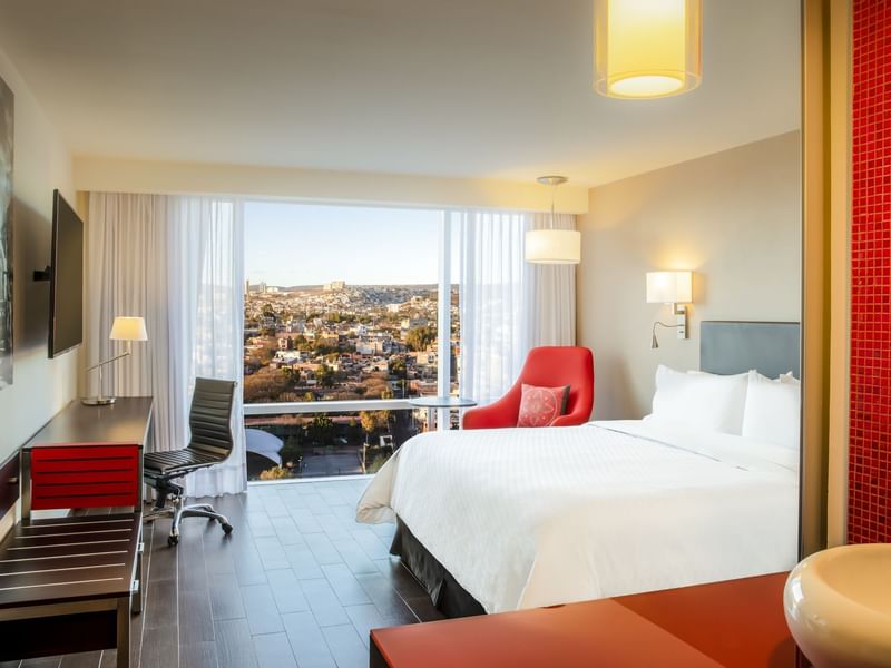 Continúa con tus objetivos en tu habitación, sé productivo en un espacio acogedor. El ambiente es cálido y el mobiliario cómodo, te ayudará a cumplir tus planes. Ten un sueño reparador y descansa profundamente en la cama King Size. Solicita a room service lo que desees del menú, mientras continúas revisando tus pendientes. Haz una pausa, transmite tu serie favorita desde tu dispositivo a la pantalla de TV, toma un baño o recuéstate en el confortable sillón.