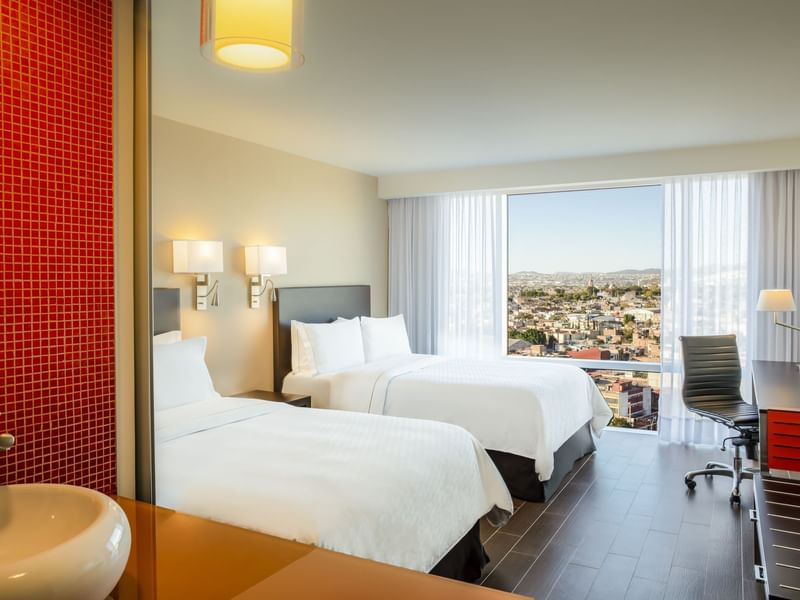 Tu habitación está diseñada para que puedas ser productivo. El ambiente es cálido y el mobiliario cómodo, te ayudará a cumplir tus planes. Queremos verte triunfar. Ten un sueño reparador y descansa profundamente en cualquiera de las camas matrimoniales. Solicita a room service lo que desees del menú, mientras continúas revisando tus pendientes. Haz una pausa, transmite tu serie favorita desde tu dispositivo a la pantalla de TV, toma un baño o recuéstate en el confortable sillón.