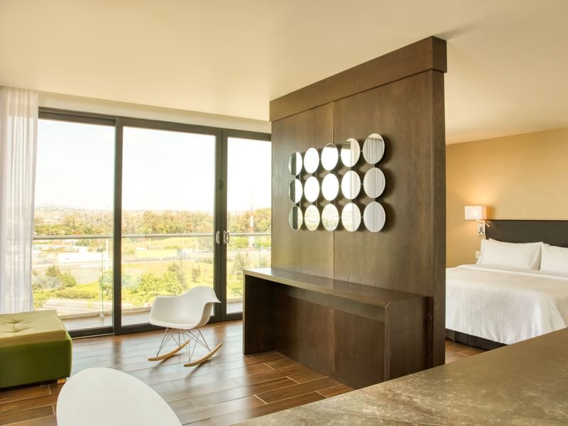 Aprovecha la amplitud de tu suite para lograr cada uno de tus objetivos. Queremos verte triunfar y por eso te apoyamos brindándote con un ambiente cálido y un mobiliario cómodo, te ayudará a cumplir tus planes. Ten un sueño reparador y descansa profundamente en una cama King Size. Solicita a room service lo que desees del menú, y disfruta del comedor o la privacidad de tu sala, mientras continúas revisando tus pendientes. Haz una pausa, transmite tu serie favorita desde tu dispositivo a la pantalla de TV, toma un baño o recuéstate en el confortable sillón.
