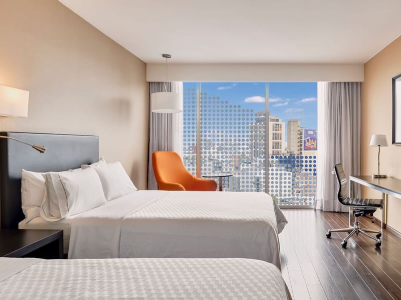 En este espacio todo está dispuesto para que elijas descansar o lograr la productividad necesaria. Sentirás como alcanzas el equilibrio en tu habitación. El ambiente es cálido y el mobiliario, cómodo y funcional. Prepárate para descansar profundamente en cualquiera de las dos camas matrimoniales. Solicita a room service lo que desees del menú, mientras ves la TV. Después de un día lleno de logros, toma un baño disfrutable. Si requieres continuar con tus pendientes, puedes hacerlo desde tu confortable sillón.
