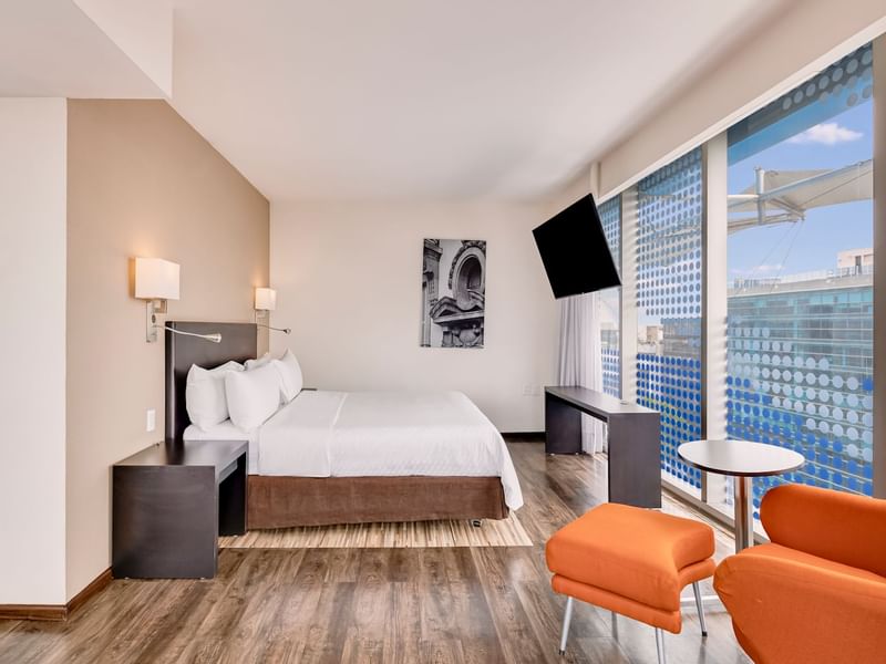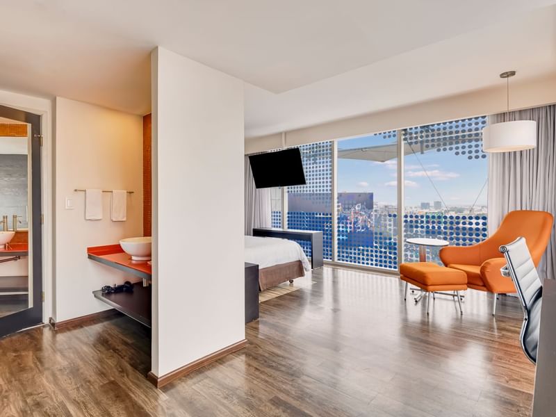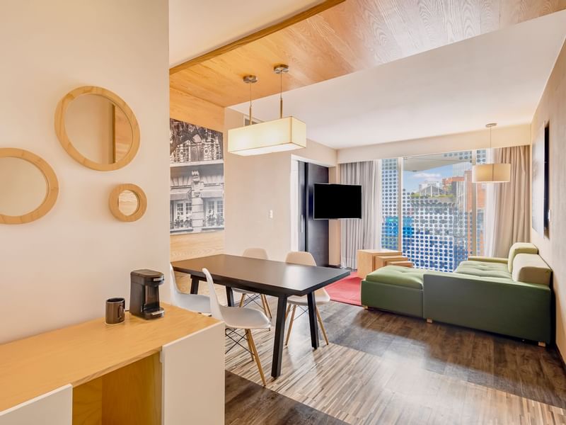 Tu suite te espera para tener días de productividad y logros, con noches relajantes. Aquí lograrás un balance, desconectate o sé activo cuando lo decidas. Reconfórtate con la amplitud de esta suite que te ofrece sala, comedor y cocineta. El ambiente es cálido y el mobiliario, cómodo y funcional. Recuéstate en tu confortable sillón y solicita a room service lo que desees del menú, mientras transmites tu serie favorita desde tu dispositivo a la pantalla de TV. Prepárate para descansar profundamente en la suave cama King Size. Si requieres continuar con tus pendientes, puedes elegir el escritorio. Esta suite tiene vista al Pepsi Center WTC