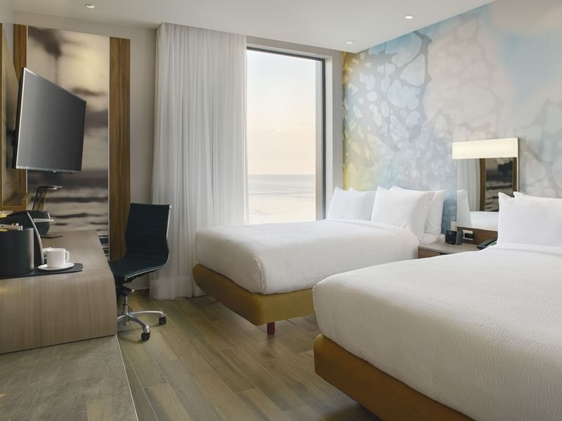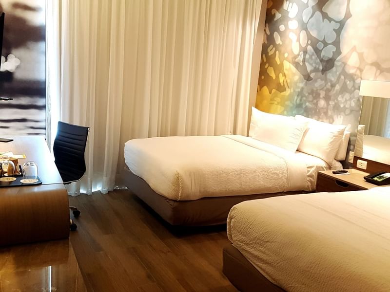 Recupera tu equilibrio en esta habitación. Todo está dispuesto para que tengas noches plenas y días productivos. El ambiente es cálido, el mobiliario cómodo y funcional. Prepárate para descansar profundamente en cualquiera de las dos camas matrimoniales. Haz una pausa y solicita a room service lo que desees del menú mientras transmites tu serie o programa favorito. Después de un día lleno de logros, toma un baño disfrutable.
