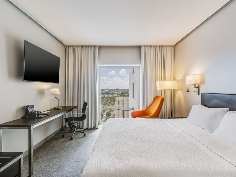 Desconéctate de todo con la seguridad de una habitación pensada para ti. Cada espacio fue creado para tu comodidad y un óptimo desplazamiento. Deseamos que descanses en las suaves camas matrimoniales y te recuestes en el confortable sillón. Solicita algo delicioso a room service o toma un baño disfrutable. Siéntete tranquilo con la barra de seguridad de la regadera, escusado elevado con agarraderas y puerta ancha.